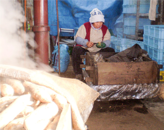 干し芋は江戸時代から作られています。作り方で一番変わったのが蒸かし方です。現在はボイラーが主流で、当時からの薪で蒸かす農家は数軒です。住谷伸男さんは数少ない薪ふかし農家のひとりです。
