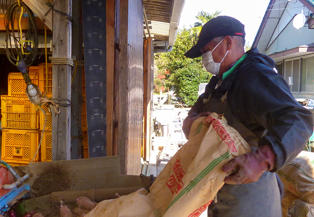 市雄さんは蒸かす前に、角切りほしいもにピッタリの紅はるかを手間を掛けて根気よく選び出します。すると蒸篭の中の原料芋が粒ぞろいになり、均一に蒸かされ、仕上がりも一律の抜群の紅はるか角切りほしいもになります。