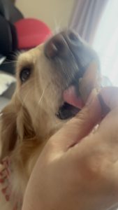 ちょっと大きめの干し芋を舌の上にのせてもらっています。