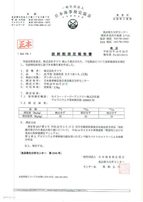 平成25年度産 【茨城県産 有機ほしいも】の放射線量の測定結果