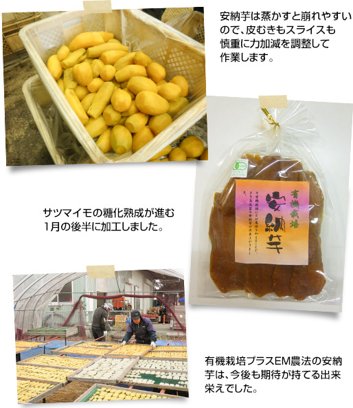 干し芋産地では栽培が大変、干し芋加工も大変という、手がかかるサツマイモですが、干し芋として食べ応えがあるので、タツマでは、有機栽培で(EM農法を取り入れて)育て、有機安納芋ほしいもを作っていこうと決めています。